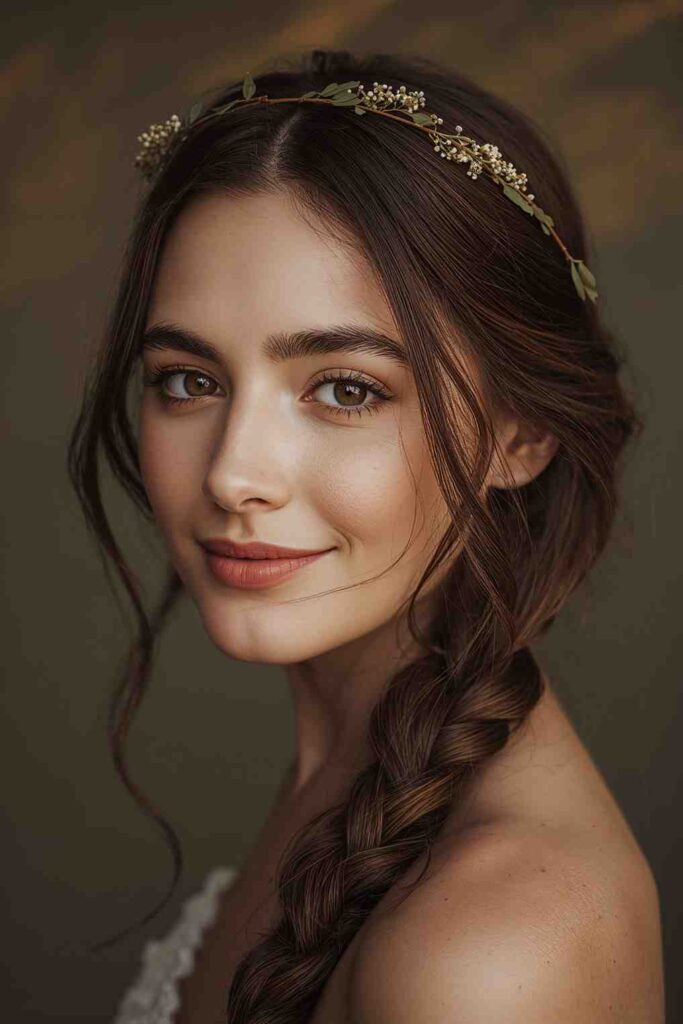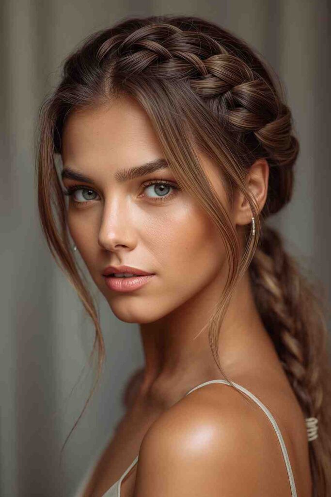 A simple braid around the crown creates a delicate, boho-inspired look. It’s ideal for autumn outings or casual dates.