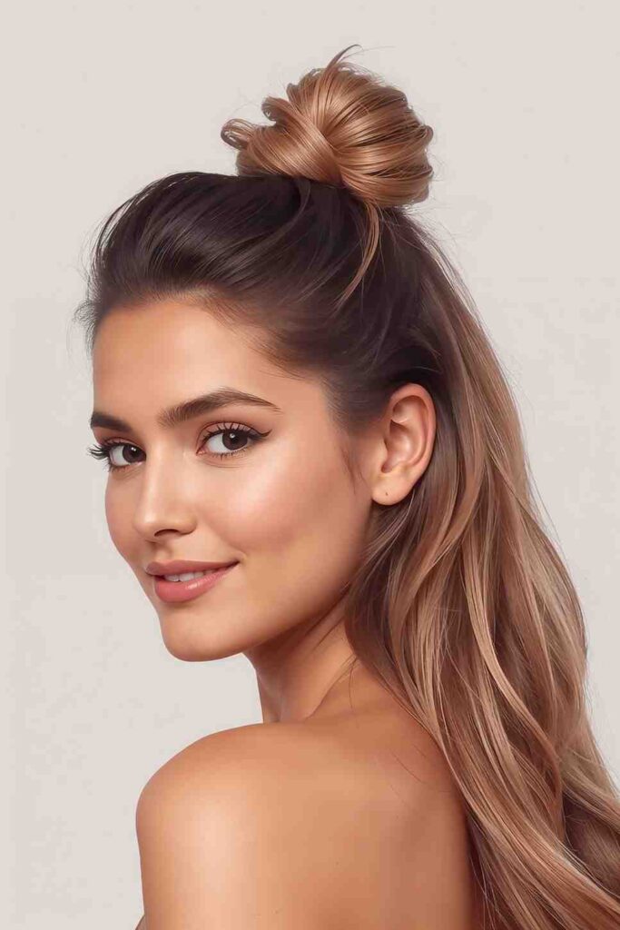 The half-up top knot combines playful style with practicality. It keeps hair out of your face while giving a modern, trendy vibe.