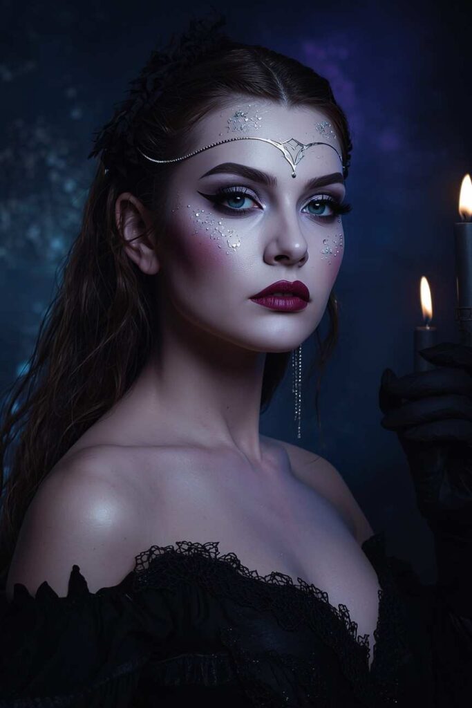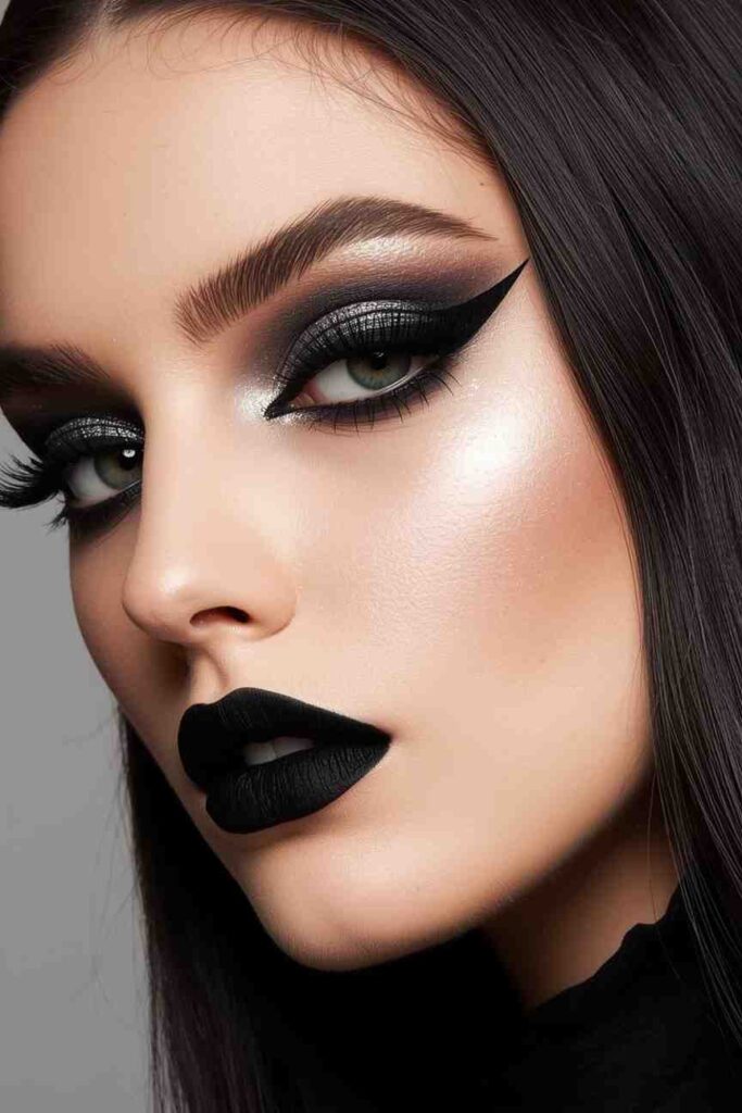 Go all in with full-on black glam. Paint your lips in inky matte black and use dark grey and silver shadows for dimension. Add winged eyeliner and false lashes for extra drama. A touch of glitter near the inner eye corner enhances the intensity. This look is bold, mysterious, and undeniably glamorous—a modern witch’s signature style.