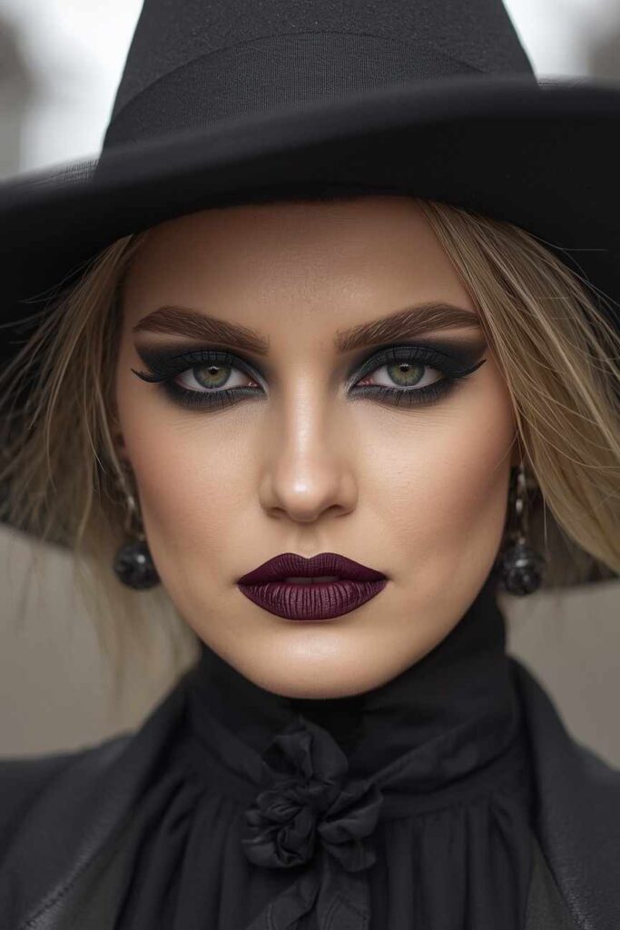 Embrace the timeless charm of dark smokey eyes and bold plum lips. Use matte black and charcoal eyeshadows for depth, blending outward for that signature sultry haze. Line your eyes with a jet-black pencil and add a coat of mascara for intensity. Finish with a deep plum or burgundy lipstick to balance drama and elegance. This look embodies the classic witch vibe—mysterious, captivating, and eternally stylish for any Halloween soirée.