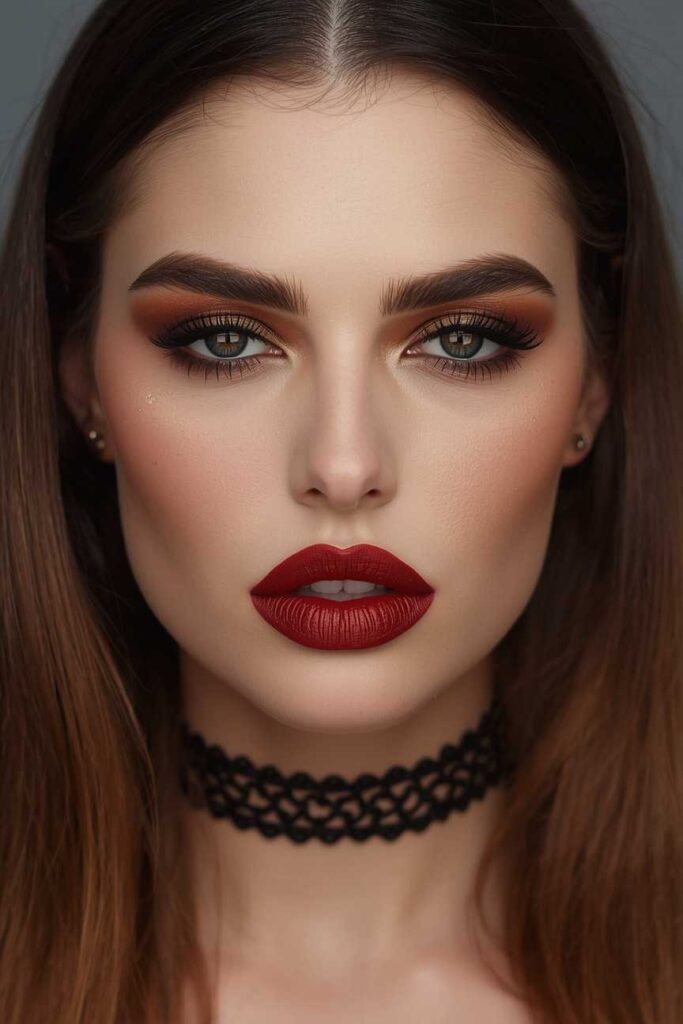 Turn heads with a fierce combination of blood-red lips and smoky copper eyes. Use bronze and rust tones for your lids, then finish with a bold matte red lip. Add subtle gold highlight on your cheekbones for warmth. This look is fiery, confident, and powerful—ideal for a witch whose spells leave lasting impressions.