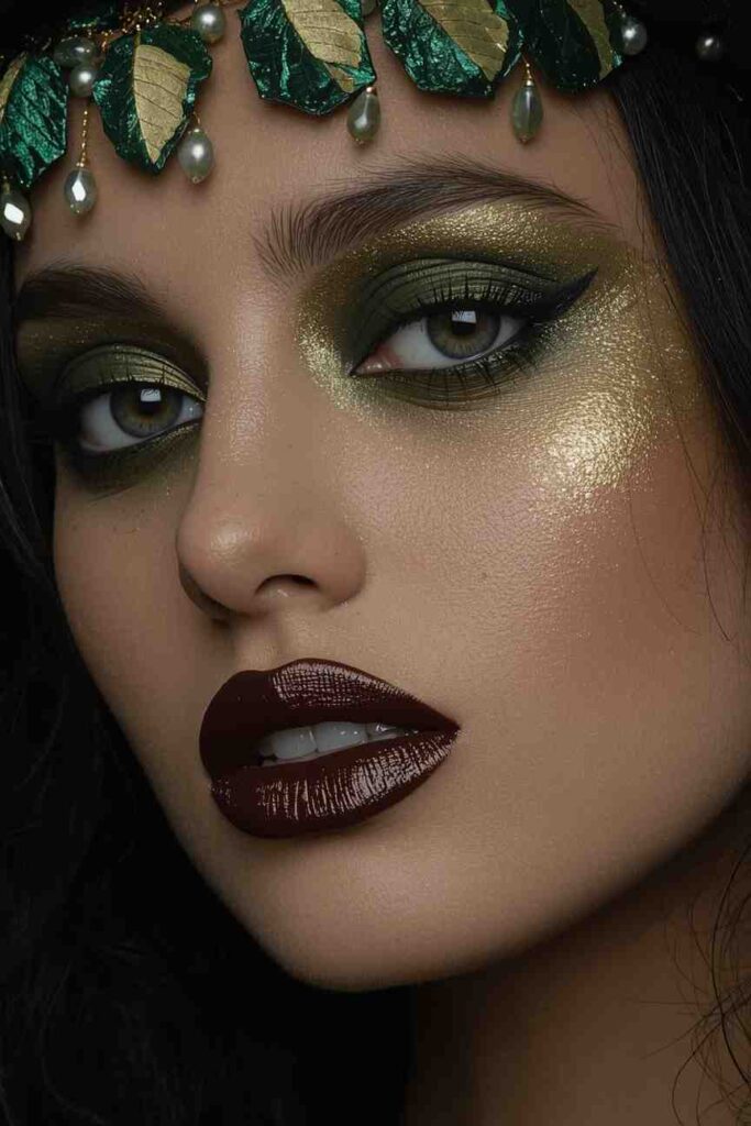 For nature-inspired witchy glam, use deep green shadows with touches of gold. Blend forest green into your crease, then dust metallic gold on the lids. Opt for dark brown eyeliner and moss-toned lipstick or gloss. This look is earthy yet regal, channeling a forest witch’s connection to nature while keeping your makeup sophisticated and mysterious.