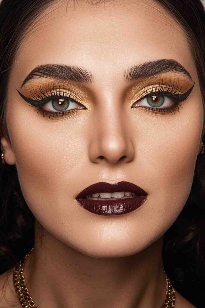 Add a royal twist with shimmering gold eyes and dark chocolate lips. Use gold metallic eyeshadow across your lids and blend into deep brown edges for contrast. A gold highlighter completes the radiant, glowing finish. This witch glows with opulence, power, and confidence—fit for a Halloween queen.