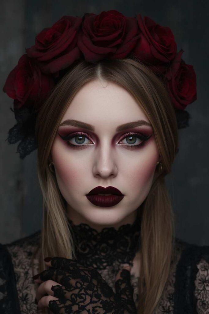 Combine romance with darkness using burgundy shadows and rose-toned highlights. Apply deep wine eyeshadow blended into the crease, and add a hint of shimmer on the lids. A vampy black cherry lipstick completes the mood. Accessorize with lace gloves or a floral crown to amplify the gothic romance. This look whispers danger wrapped in beauty, perfect for a witch who loves elegance with an edge.