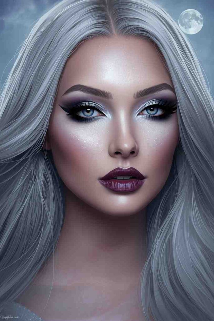 Channel lunar magic with metallic silvers and icy highlights. Start with a smokey base, then layer silver shimmer across your eyelids. Add highlighter to the inner corners of your eyes and cheekbones for an ethereal glow. Pair it with a frosted nude lip for contrast. The cool tones mimic moonlight, creating a luminous and otherworldly vibe—ideal for a celestial witch.