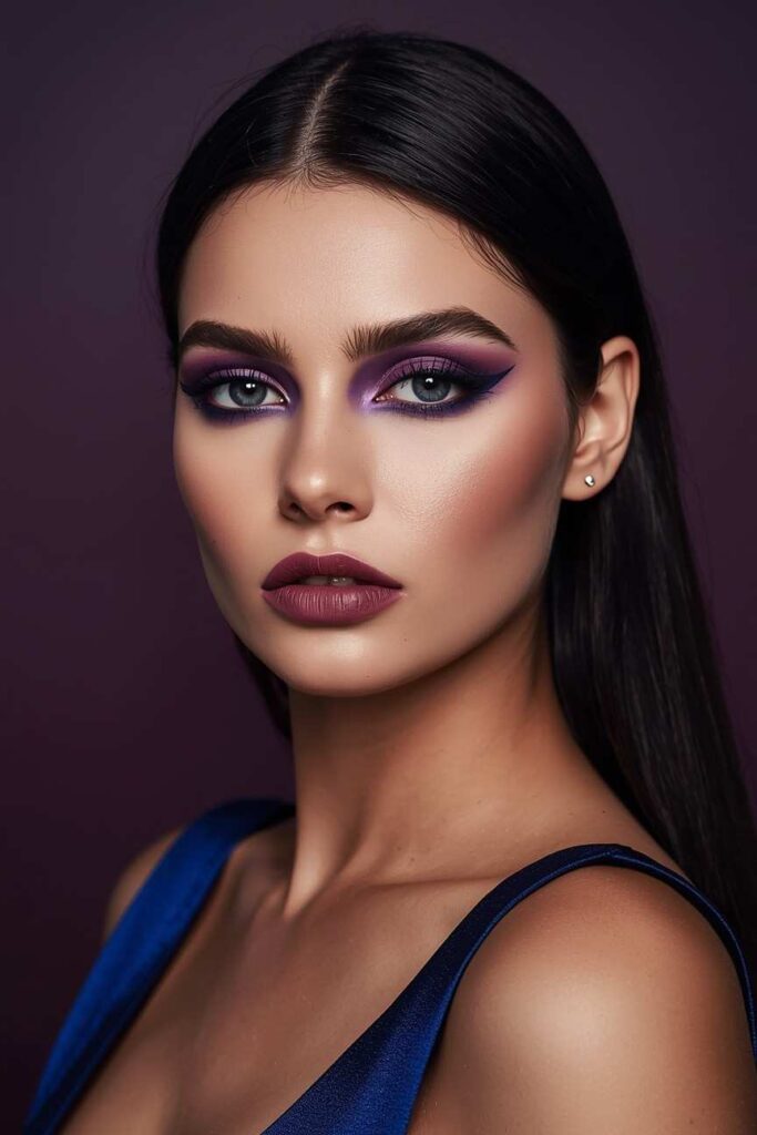 Mix navy and plum for an intoxicating twilight effect. Blend them smoothly to mimic the night sky, finishing with violet eyeliner and a soft matte lip. The look feels deep and mysterious, balancing glamour and darkness perfectly. It’s ideal for evening Halloween parties where the lighting highlights your mystical makeup artistry.