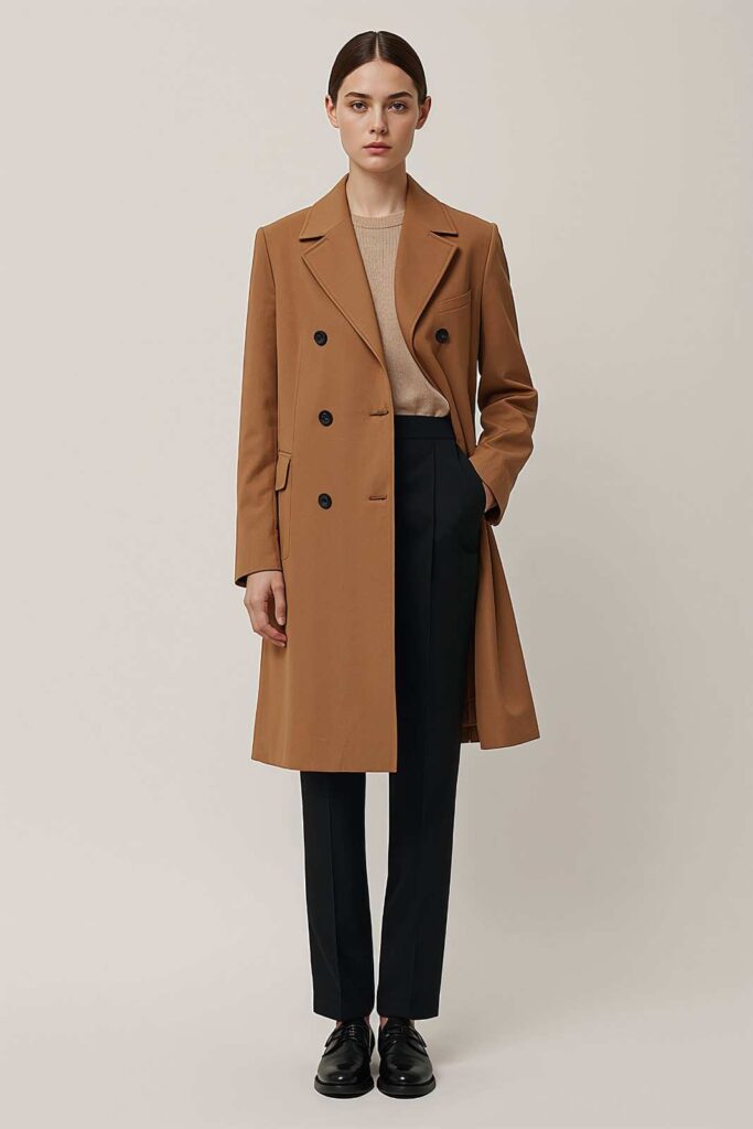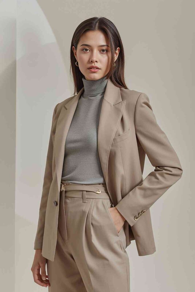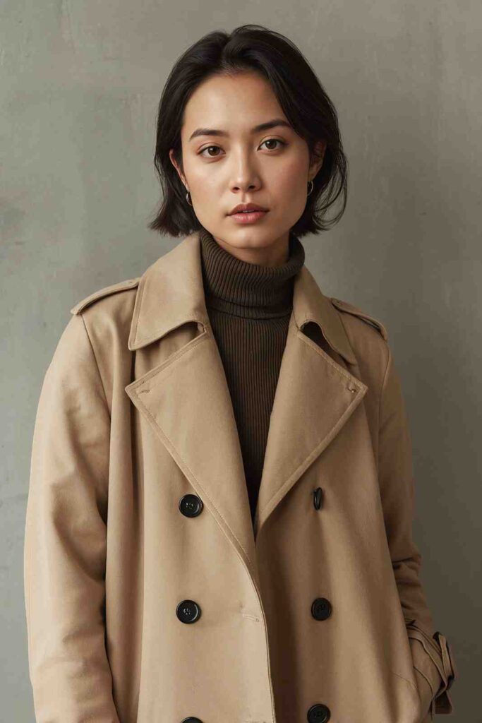 A classic trench coat layered over a turtleneck screams timeless sophistication.
