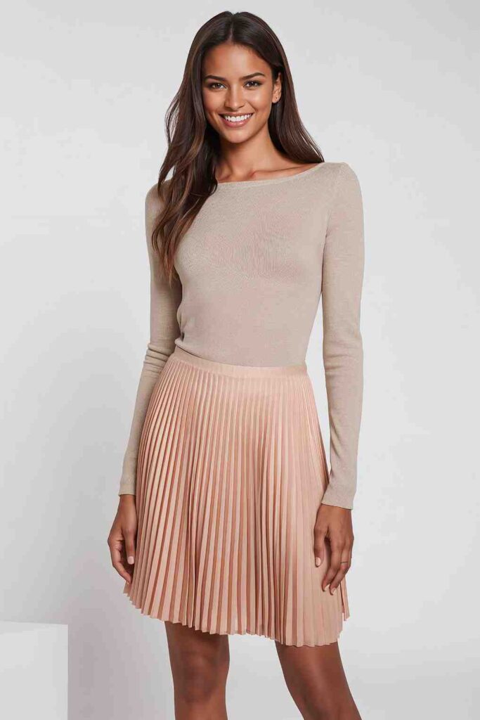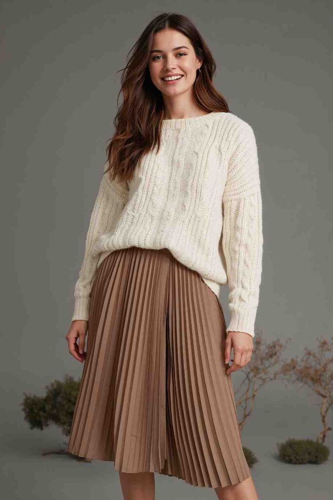 A pleated skirt with a fitted sweater looks luxurious without costing a fortune.