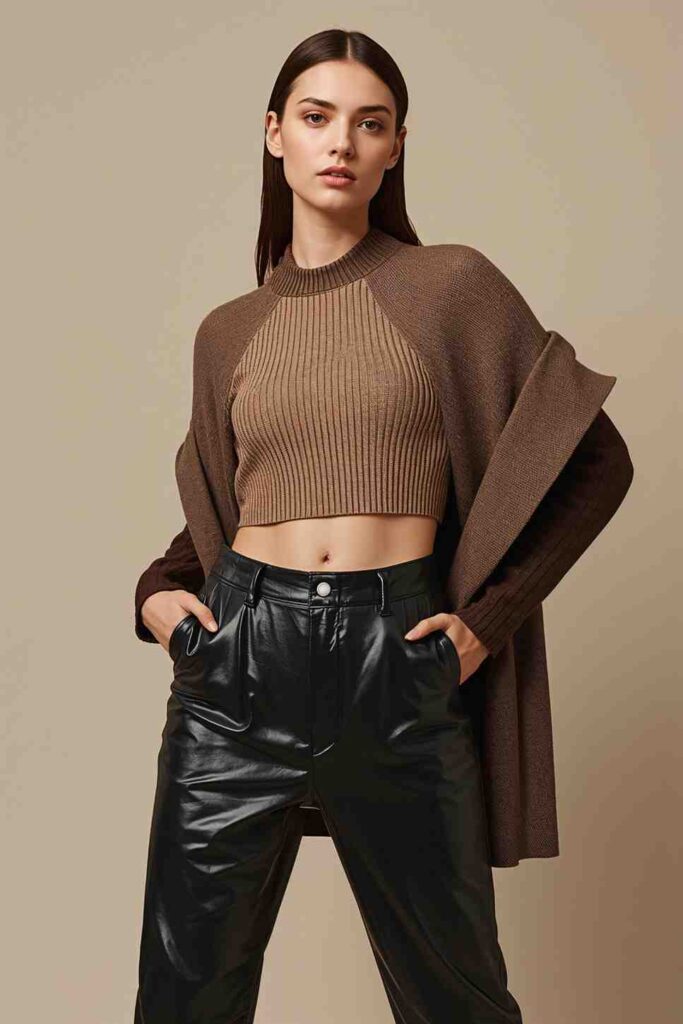 Faux leather pants paired with a knit top create a sleek, sophisticated outfit.