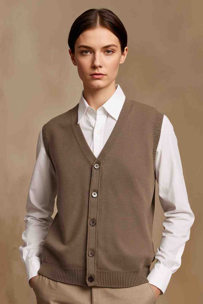 Layering a sweater vest over a crisp white shirt creates an elegant preppy look.