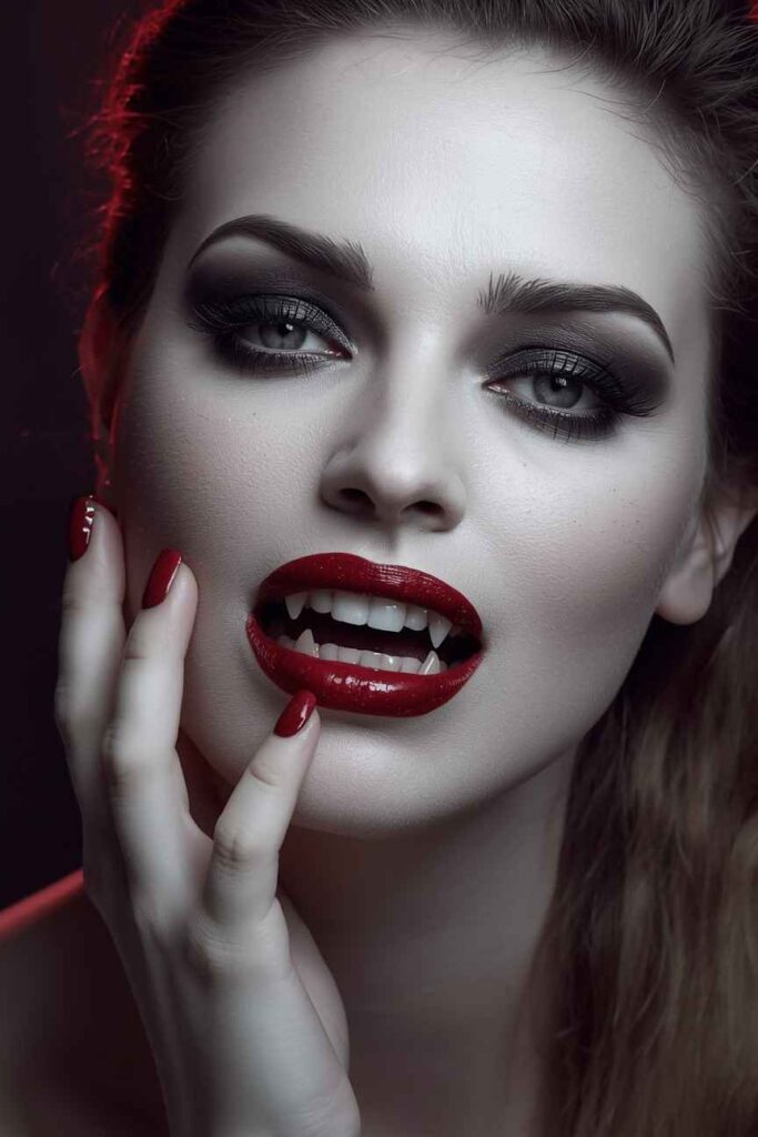 Go classic yet bold with pale white skin, darkened eyes, and deep red lips. Drip fake blood from the corners of your mouth for a chilling touch. Contour with gray to hollow the cheeks and emphasize the undead look. This timeless vampire style is fierce, seductive, and hauntingly iconic.