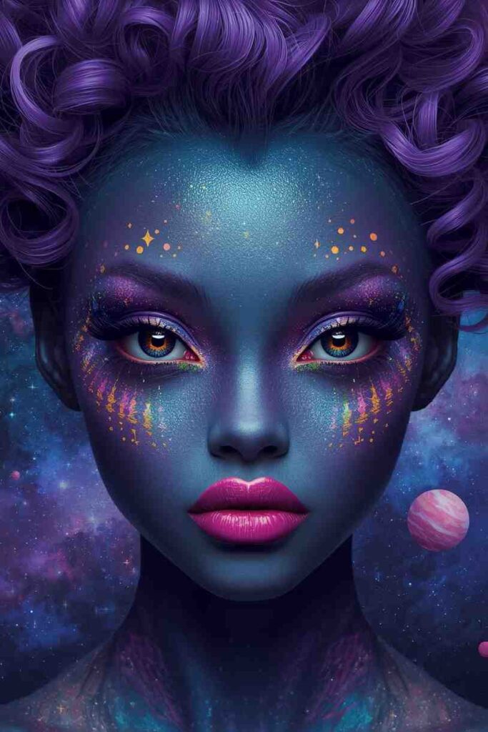 Create a cosmic masterpiece with deep purples, blues, and blacks blended across your face. Add white dots and tiny stars for that starry-sky illusion. For extra glam, include silver shimmer on the cheekbones and forehead. The Galaxy Goddess look is celestial, mysterious, and utterly enchanting.