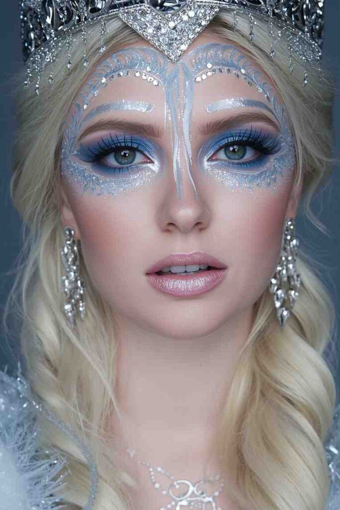 Paint your face with frosty blues and silvers, adding sharp white accents to resemble icy textures. Glue on small rhinestones or glitter for a frosted crown effect. The icy shimmer against cool-toned paint creates a regal, powerful aura fit for an Ice Queen ruling her winter kingdom.