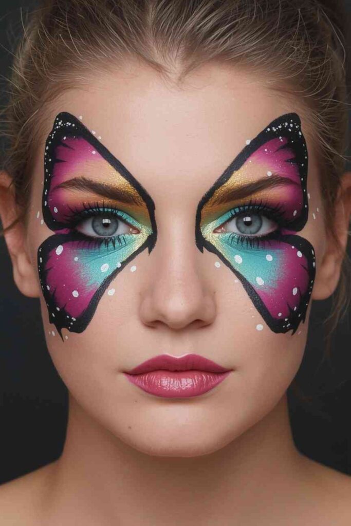 Paint symmetrical wings across both sides of your face, using bold shades like fuchsia, teal, and gold. Outline them in black to define the pattern, and add dots of white to mimic sparkle. This ethereal design brings whimsical beauty, making it ideal for anyone who wants an elegant yet striking Halloween look.