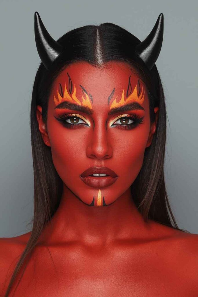 Paint your face in bold reds with black contouring to define sharp cheekbones. Add flame patterns rising from your temples and chin. Gold or orange highlights enhance the heat effect. This look radiates bold energy and confidence—ideal for those who love fiery, powerful personas.