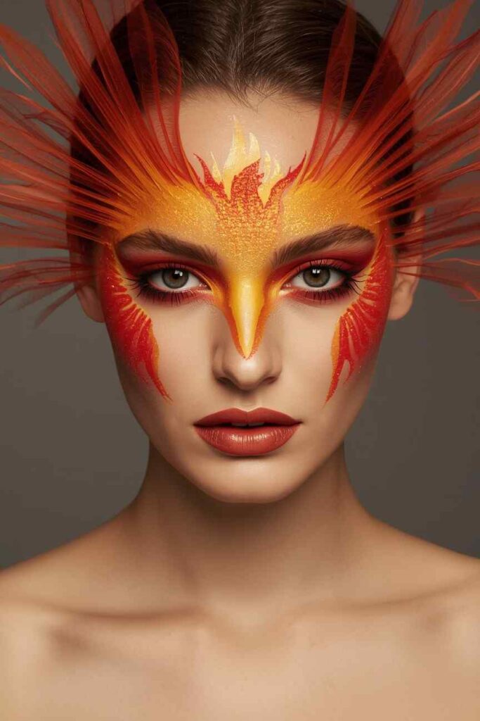 Turn up the heat with a fiery phoenix spreading across your face. Blend red, orange, and yellow hues for a flame-like effect, and extend feathered strokes outward from your eyes and temples. A touch of gold shimmer adds magic, while dramatic lashes complete the fierce, reborn-from-the-ashes energy.