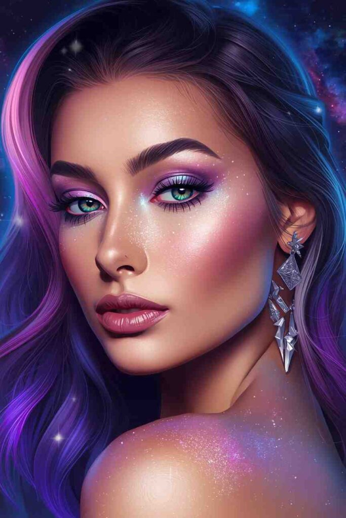 Blend metallic greens, silvers, and purples across your skin. Draw geometric lines or otherworldly patterns for a futuristic vibe. Highlighter and shimmer add a radiant glow. This alien design feels ultra-modern and mysterious—perfect for anyone wanting to stand out from the crowd.