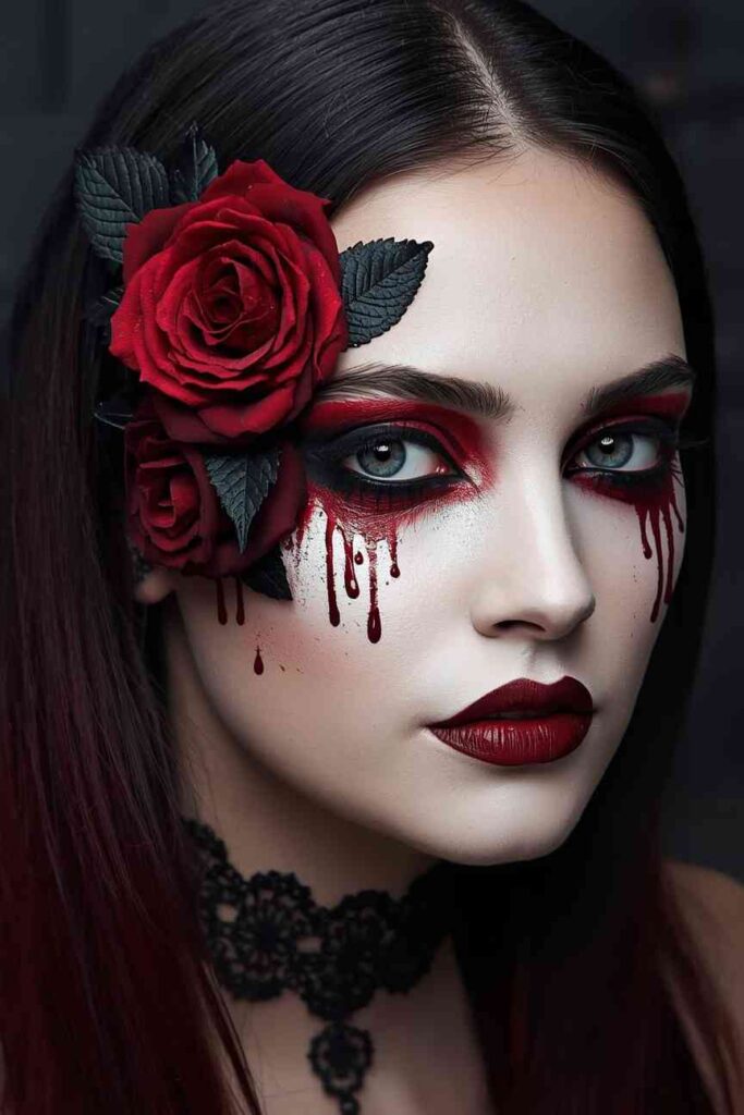 Start with a pale face and deep red rose designs creeping across one side of your cheek and forehead. Add black leaves and blood-like drips for drama. The mix of romance and darkness makes this look hauntingly beautiful and perfect for moody Halloween aesthetics.