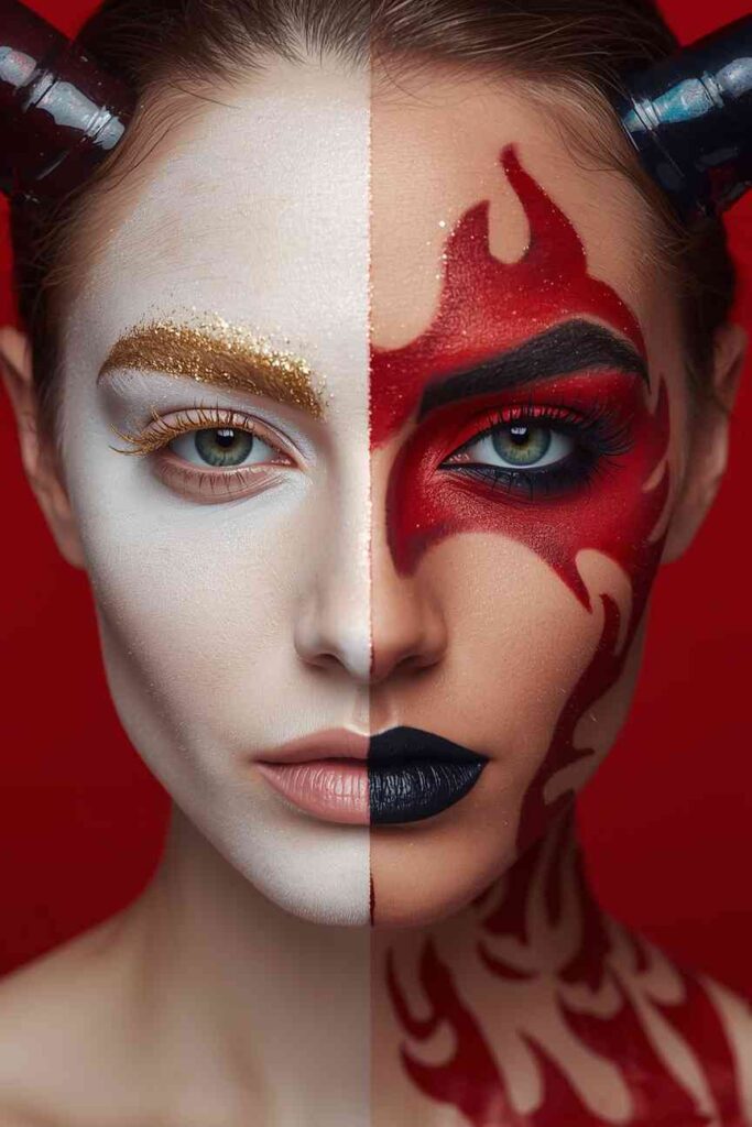 Split your face down the middle—paint one side soft white with gold shimmer and the other fiery red or black. The contrast represents duality: light versus darkness. Add glitter, lashes, or horns for intensity. This design is a conversation starter and a visual statement that’s both artistic and symbolic.