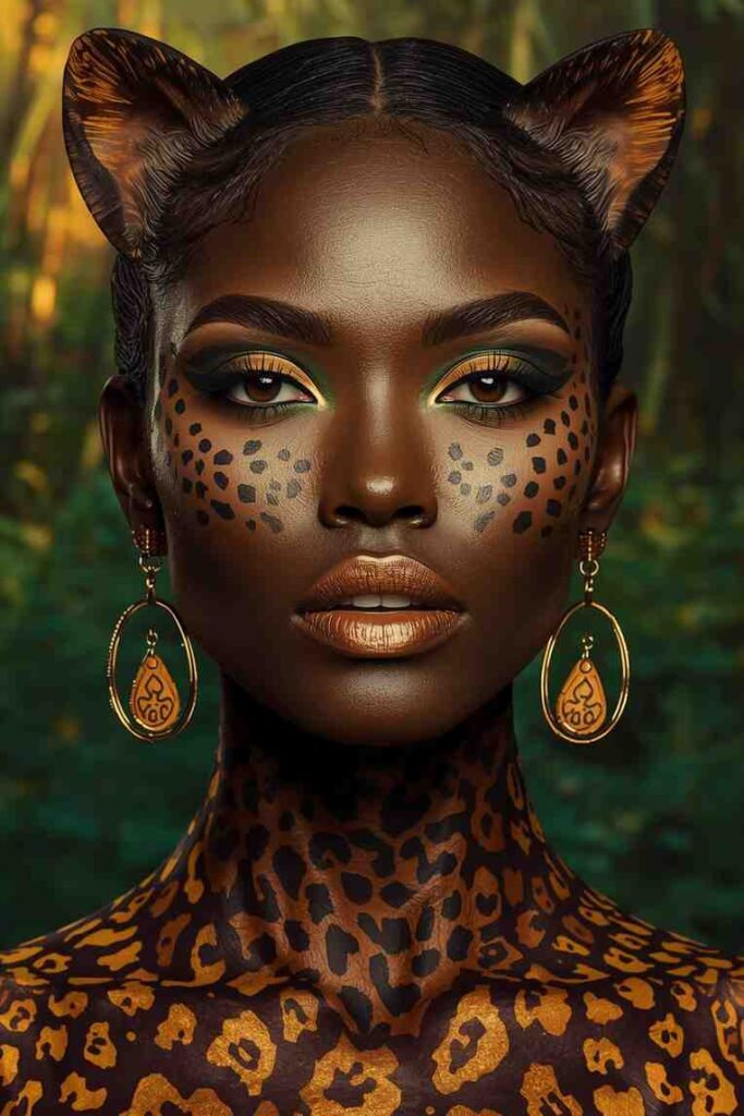 Paint spots and whiskers in shades of gold, bronze, and black for a fierce feline finish. Highlight your eyes with black liner to mimic wild-cat eyes, and blend warm brown tones for depth. This design exudes power and glamour, giving you a bold, animalistic vibe.