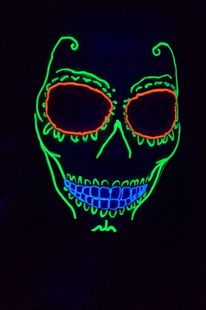 Light up the night with a neon skull design that looks like it came straight out of a rave. Use black as the base and outline the skull features in bright neon shades like green, orange, or blue. Add white highlights to make the bones pop. Under UV lights, this look becomes an electrifying showstopper—perfect for parties and night events.