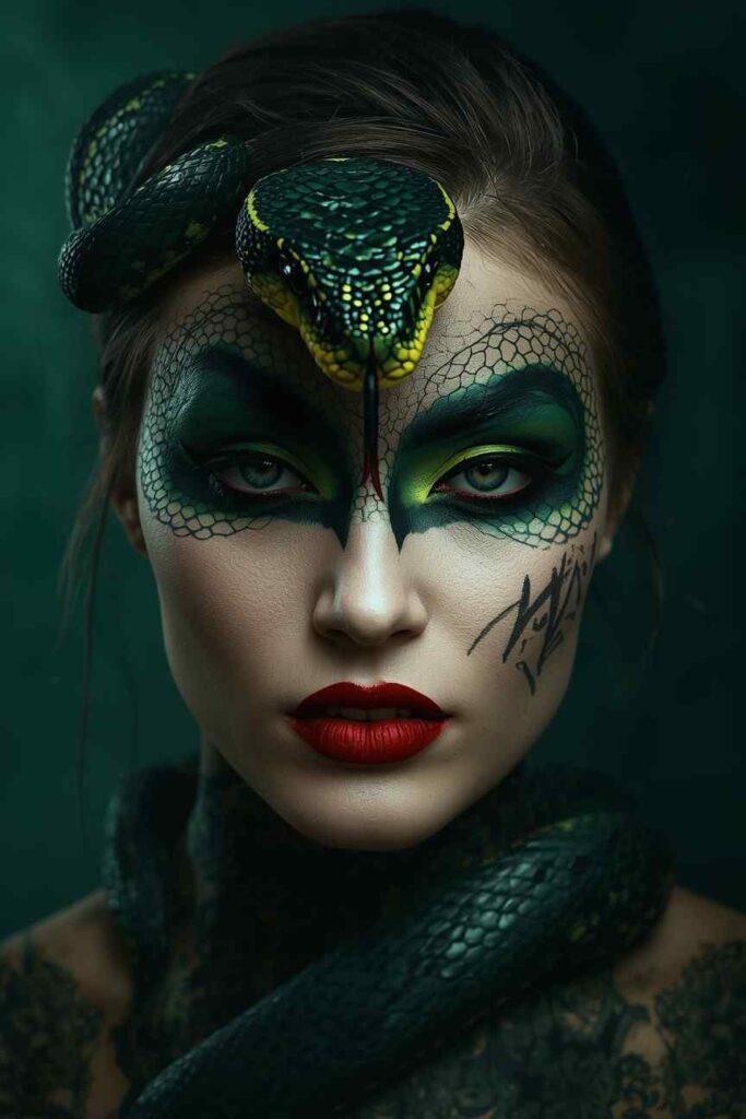 Use green, gold, and black to create scaly effects across your face and neck. Blend metallics to mimic snake skin and add yellow eyeshadow around your eyes for that reptilian stare. A forked tongue detail near the mouth seals the venomous allure—daring and dangerously beautiful.
