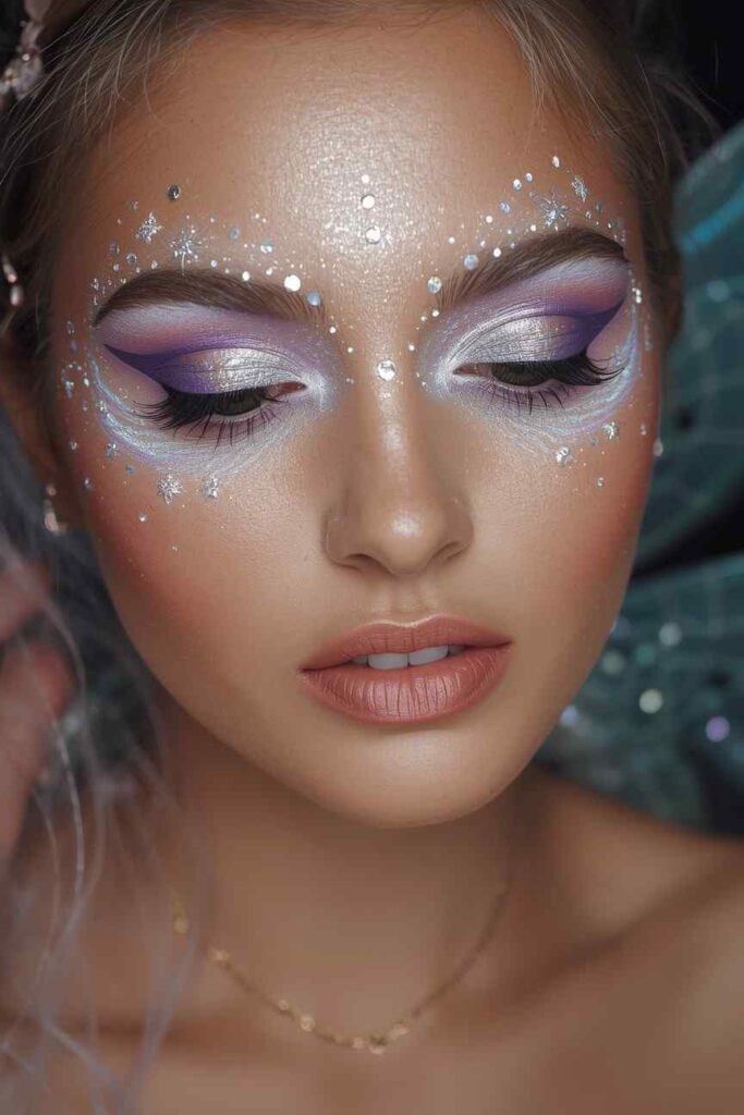 Use iridescent pinks, silvers, and soft purples to paint twinkling stars and delicate swirls around your eyes. A dash of glitter and rhinestones across your cheeks creates fairy magic. This enchanting look glows softly and adds dreamy elegance to your Halloween night.