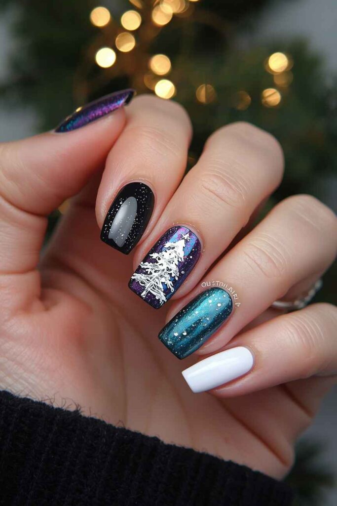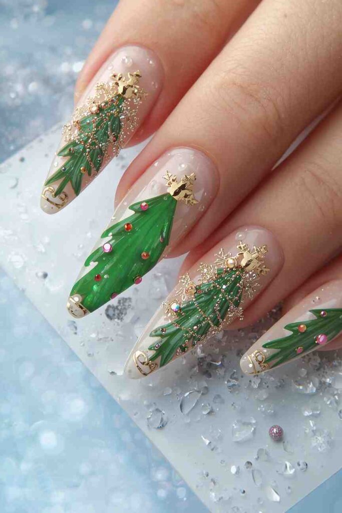 You can keep the base neutral for a balanced look or go bold with deep red or midnight blue for extra drama. These nails instantly lift your mood and add a glamorous twist to traditional Christmas tree art.