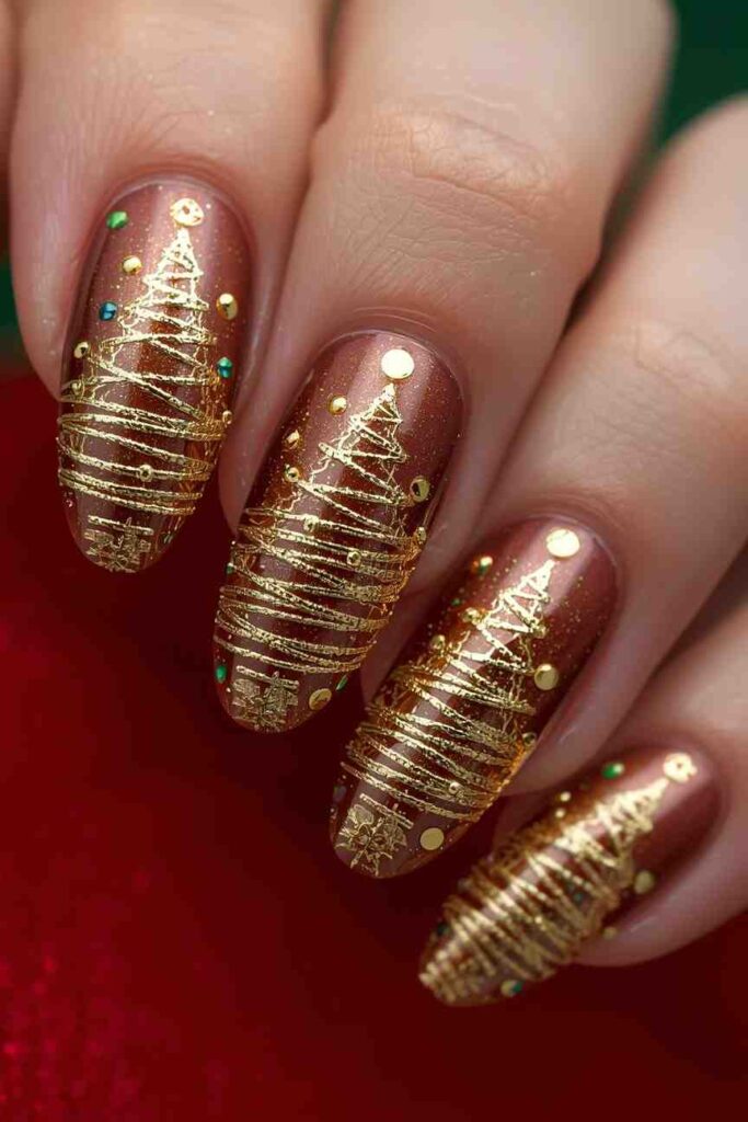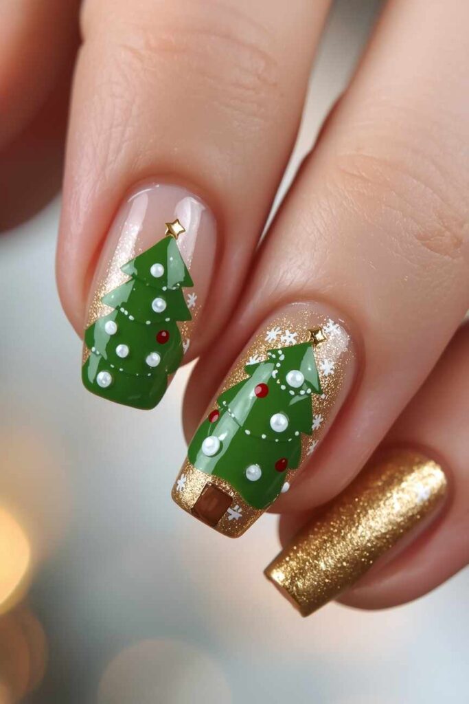 Gold Christmas tree nails create a luxurious, warm, and festive look. Using gold foil, metallic polish, or hand-painted gold trees instantly elevates your manicure to holiday-chic perfection.