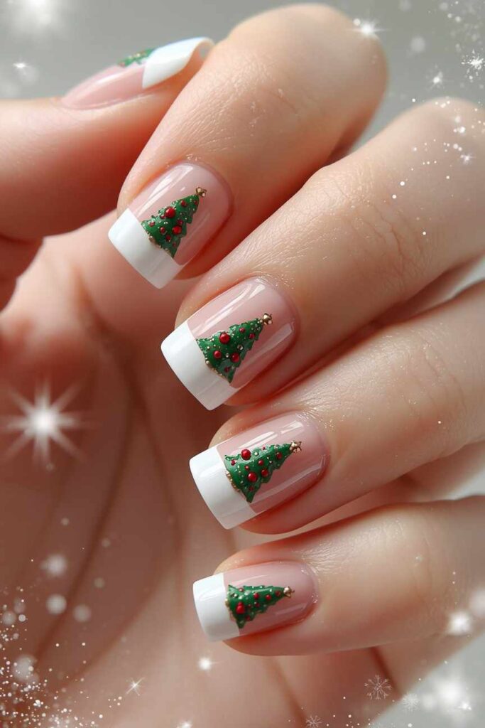 French tip Christmas tree nails refresh the classic French manicure with a festive twist. Instead of the traditional white tips, green tree-shaped tips create a playful yet polished look.