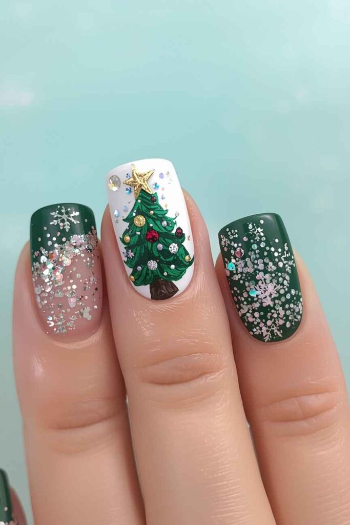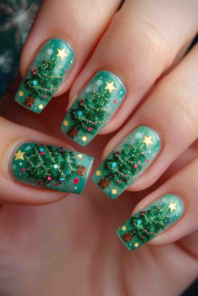 Classic green Christmas tree nails never go out of style because they capture the true essence of holiday beauty. With a soft nude or pastel base, the vibrant green tree becomes the focal point while tiny ornaments, star toppers, and subtle glitter enhance the design.
