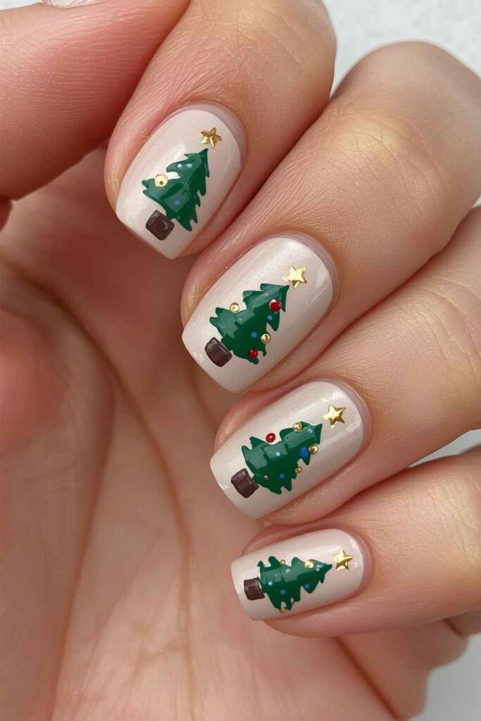 This timeless style suits all nail shapes and lengths, making it an easy choice for anyone wanting a festive upgrade. Whether you draw one statement tree or multiple tiny ones on each nail, this design adds warmth and tradition to your holiday look.