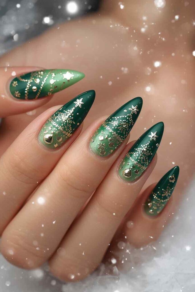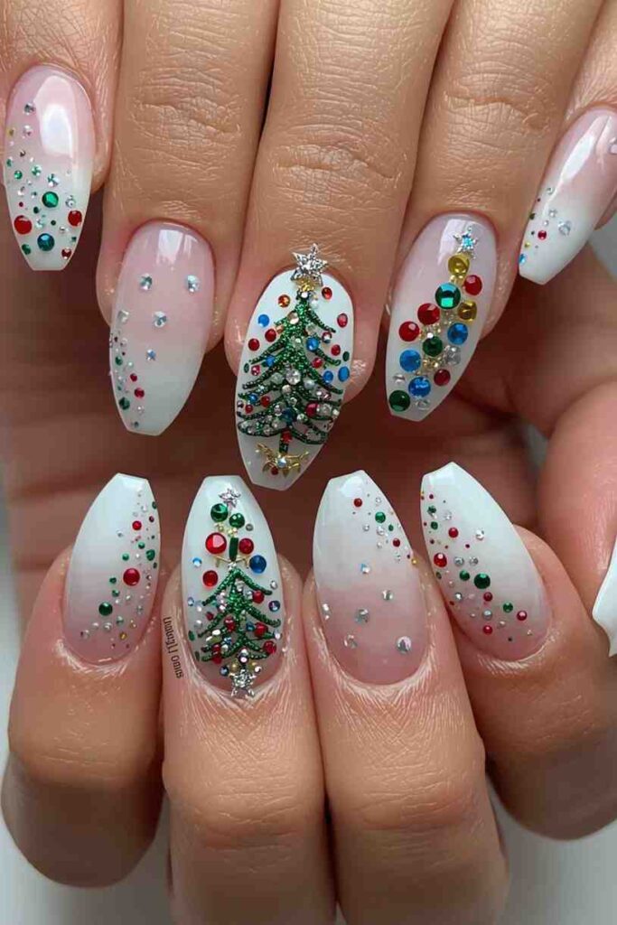 Ombre Christmas tree nails combine color transitions with elegant tree designs for a stunning holiday effect. The gradient base — from nude to green, red to gold, or blue to white — adds depth and charm.