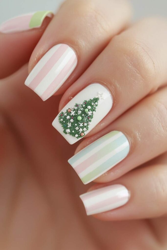 Pastel Christmas tree nails offer a soft, dreamy version of holiday nail art. Mint green, pastel pink, lavender, or baby blue bases give a whimsical touch, while fine white or silver tree accents complete the design. This aesthetic feels sweet, delicate, and perfect for those who prefer softer colors.
