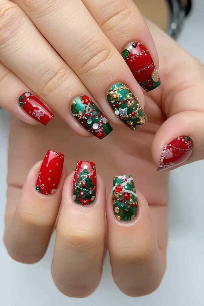 Red and green Christmas tree nails use the season’s most iconic colors to create a cheerful, classic look. Bright red nails with green tree accents or alternating red and green designs feel bold and joyful.