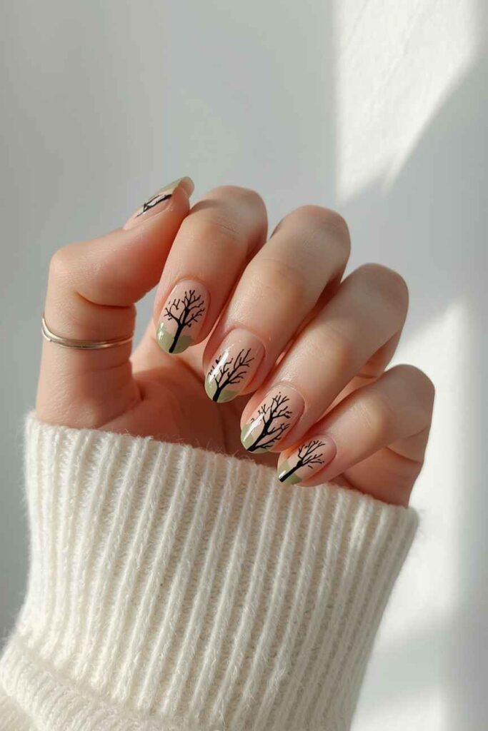 Tree outline nails offer delicate detailing without overwhelming the design. These nails use fine lines to sketch the tree shape on a neutral or pastel winter base, creating a soft, airy look.