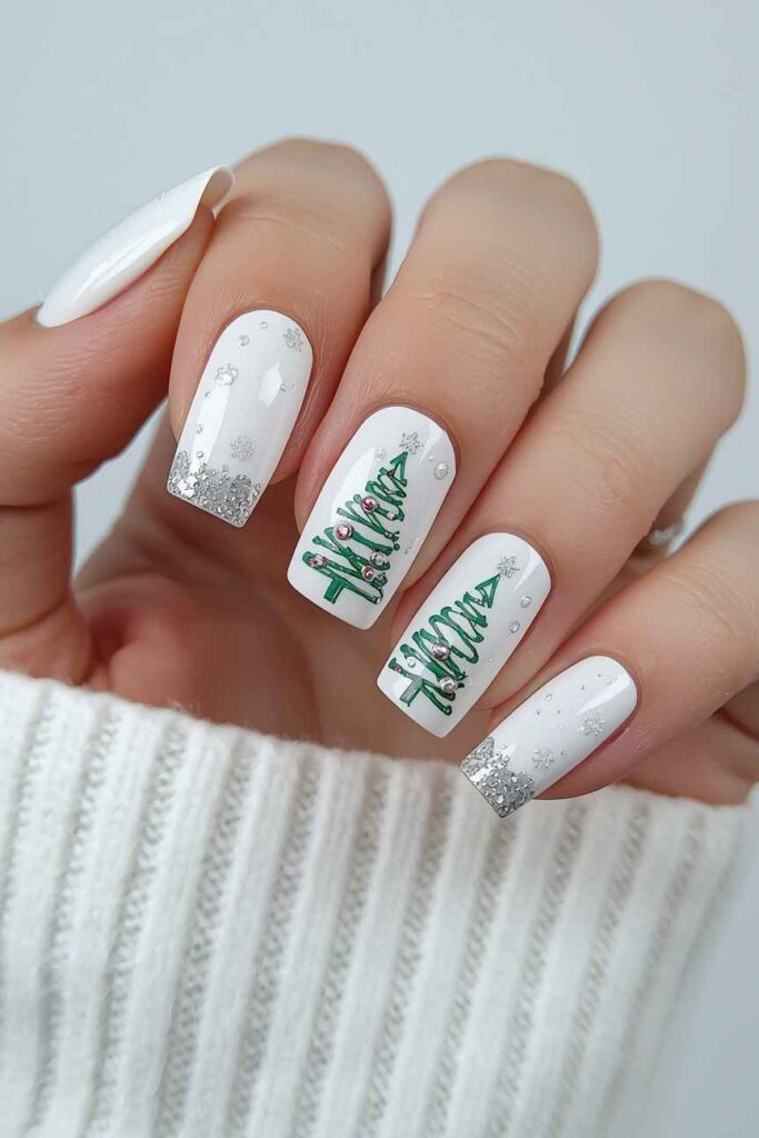 White Christmas tree nails feel crisp, modern, and elegant. Whether painted on a nude, silver, or dark base, the white tree stands out beautifully. This design resembles snowy Christmas décor, making it a refreshing twist on the traditional green. You can add subtle glitter or keep it matte for a sleek effect.
