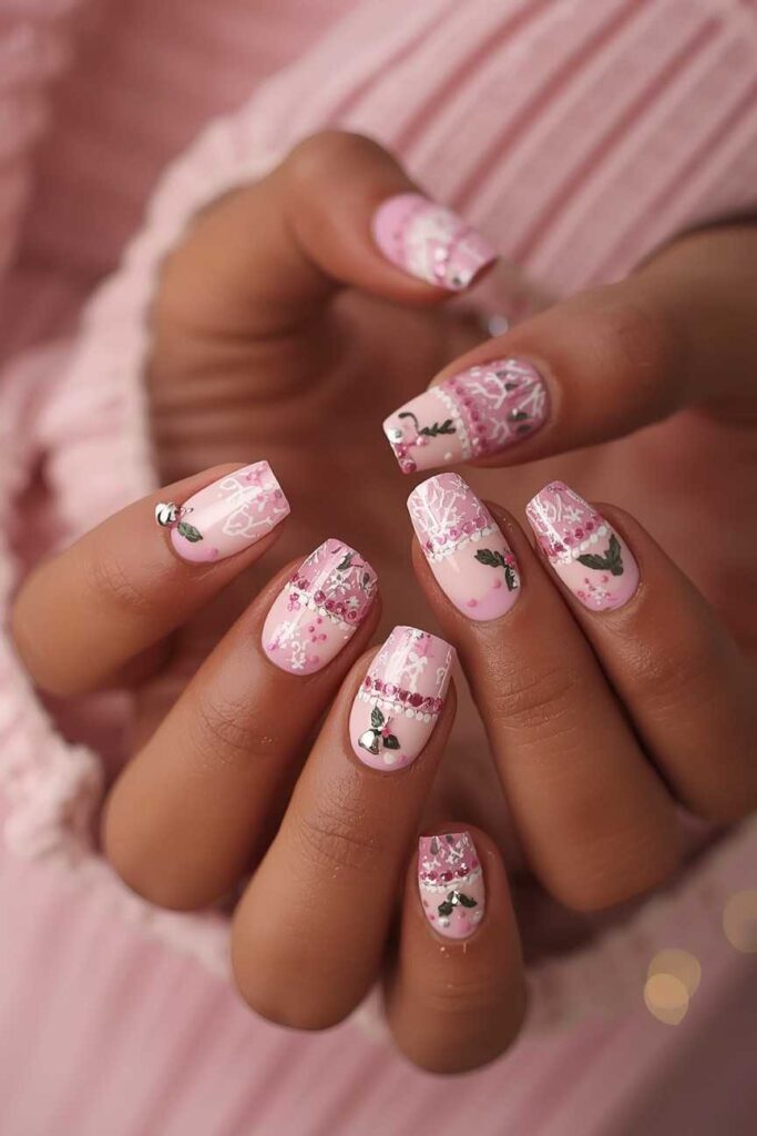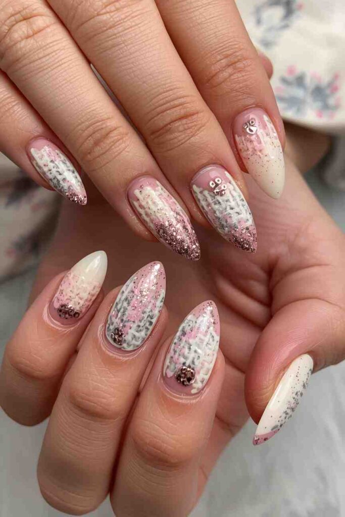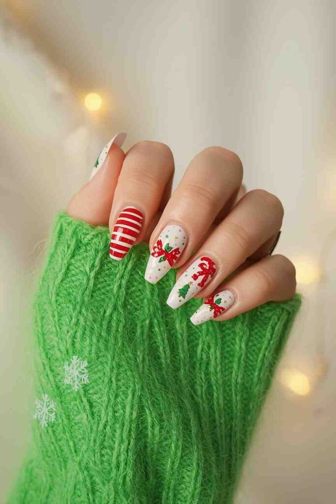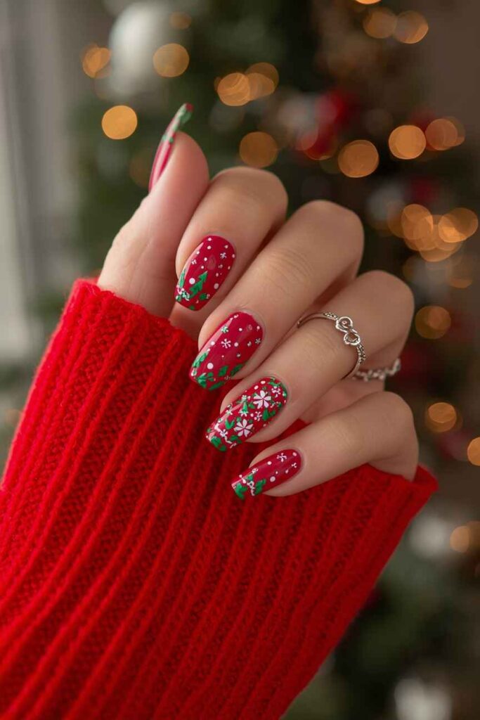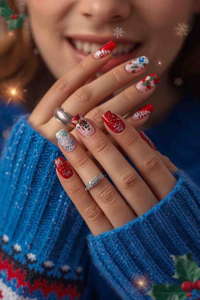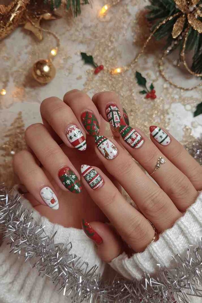 Mix-and-match sweater nails offer a fun and creative way to express your holiday style. Combining different sweater patterns, winter motifs, and complementary colors, this design brings variety and personality to your manicure. You can choose a palette of whites, reds, greens, or nudes and incorporate snowflakes, hearts, or glitter accents for added charm.