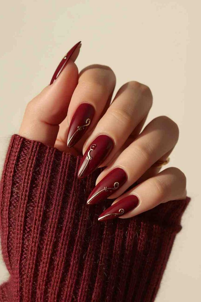 This design combines warmth with sophistication, making it ideal for anyone who wants a cozy yet glamorous manicure. The combination of matte burgundy and gold gives your nails a beautifully refined finish.