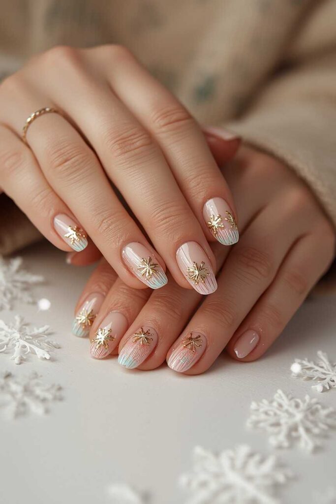 This manicure is perfect for those who prefer understated beauty but still want a seasonal element. The combination of soft neutrals and winter motifs makes it easy to style with any outfit, especially cozy loungewear or layered winter ensembles.