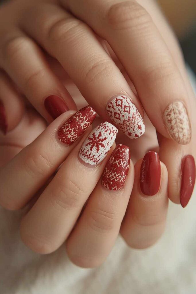 Sweater nails with matte red accents combine classic winter textures with bold, festive color. Using a neutral or soft base for the sweater pattern and adding matte red accent nails creates a beautiful contrast that feels warm and stylish.
