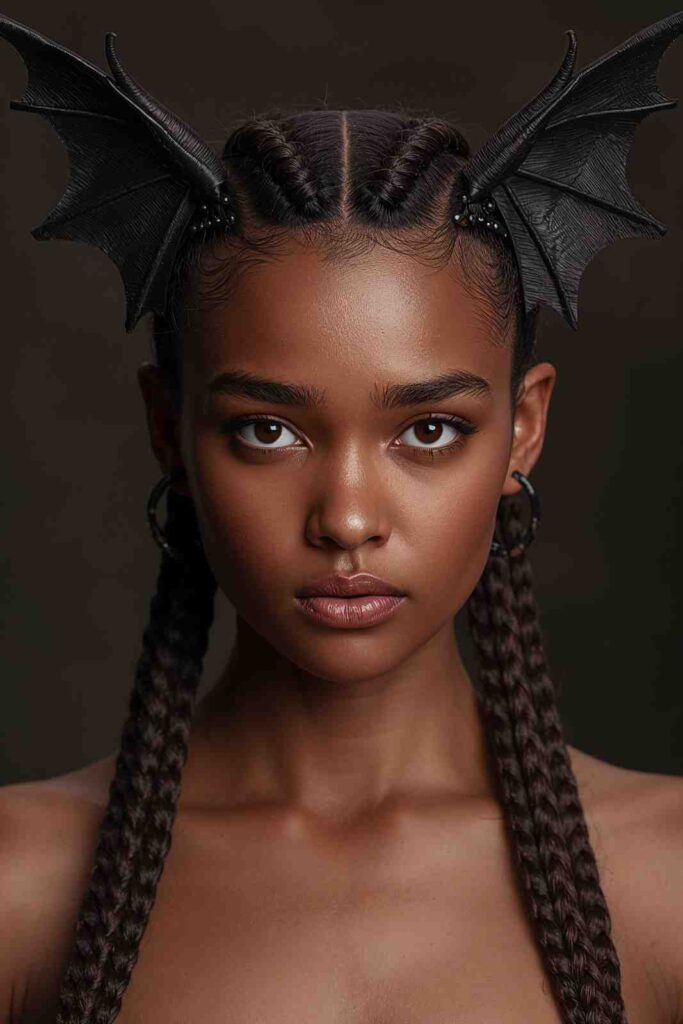 Braids shaped into bat wings across the back of the head look intricate and stunning. This one’s a guaranteed showstopper.
