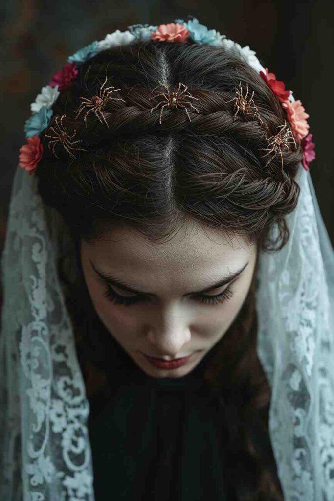 A crown braid decorated with fake spiders, flowers, or lace veils turns into a hauntingly beautiful hairstyle.