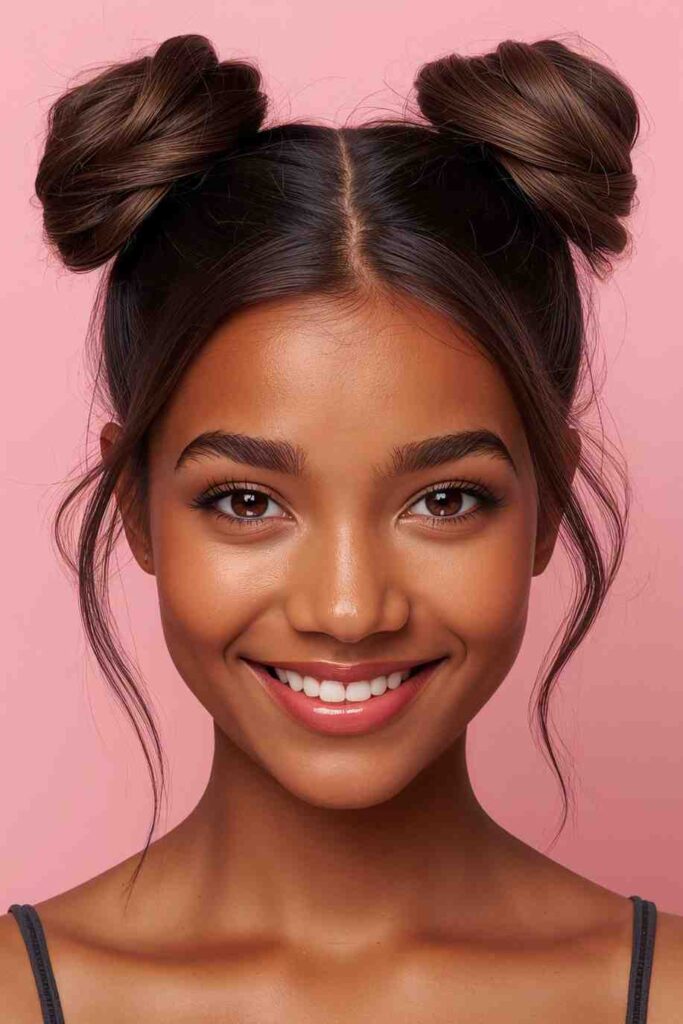 Two twisted buns at the crown create cute little devil horns without needing a headband.