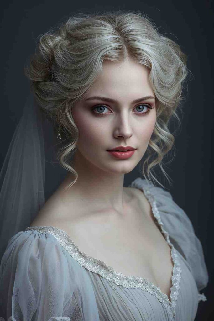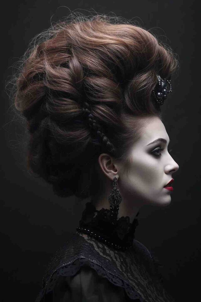 A voluminous updo with teased roots, braids, and dark accessories gives a moody gothic feel. Ideal for vampire queens or haunted dolls.