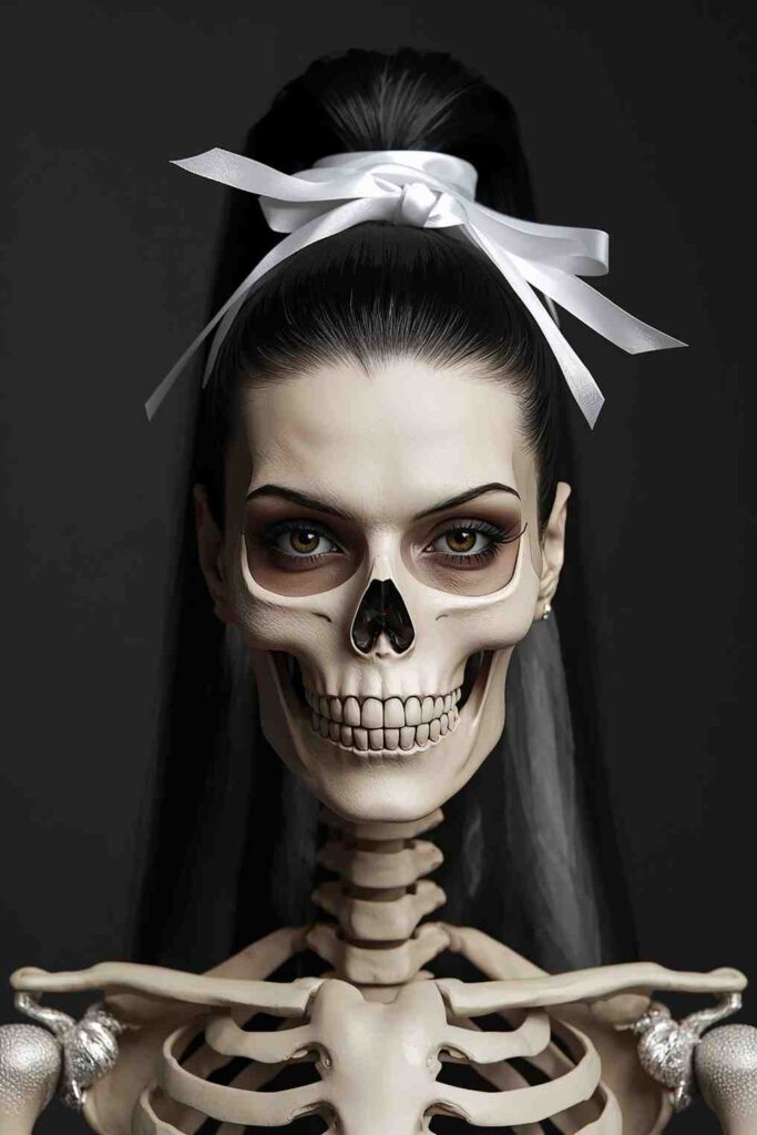 A high ponytail wrapped with white ribbon or silver accessories gives a modern skeleton look that’s chic and party-ready.