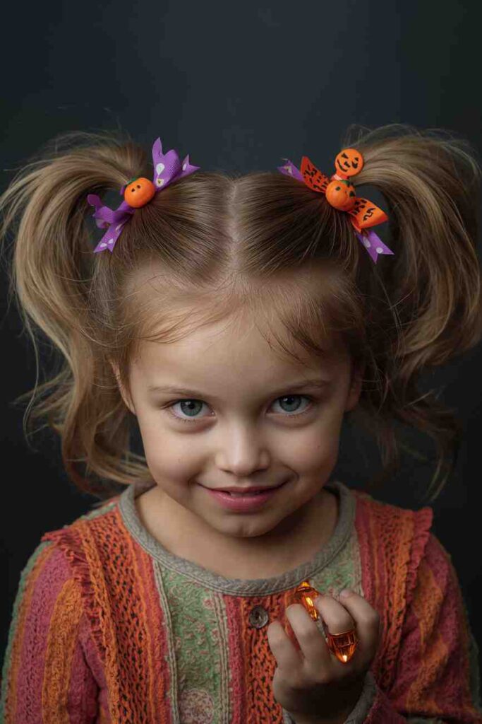 High pigtails teased for volume and decorated with ribbons or Halloween clips are fun and slightly spooky.