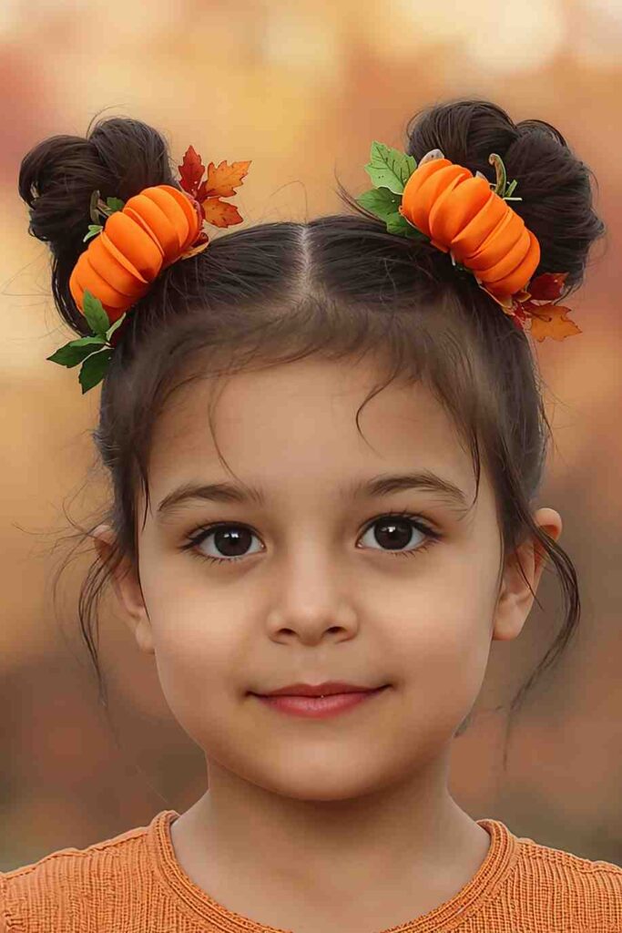 Two top buns decorated with orange spray, green ribbons, or leaf clips mimic mini pumpkins—cute and festive!