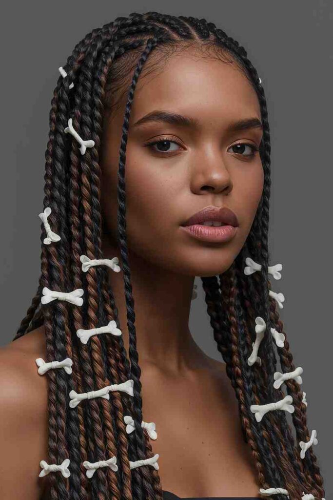 Tight braids decorated with white ribbons or clips resemble skeleton bones running through your hair—spooky yet stylish.