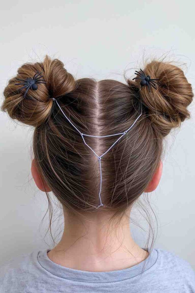 Two space buns with white hair string crisscrossed between them form a cute spider web effect. Add tiny spider clips for extra flair.